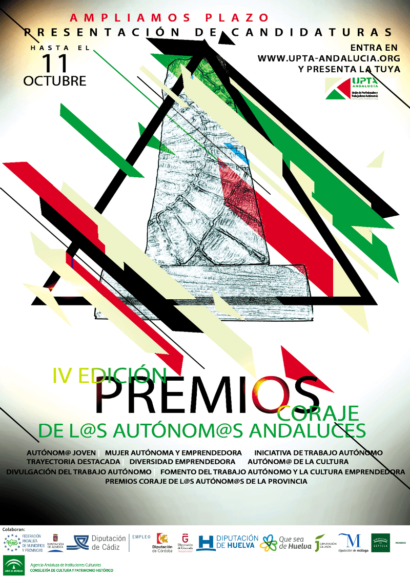 UPTA Andalucía convoca la IV Edición de los Premios “Coraje de l@s autónom@s andaluces” para seguir visibilizando, promocionando y reconociendo a los trabajadores y trabajadoras autónomos. Hasta el 11 de octubre de 2019 permanecerá abierto el plazo de presentación de candidaturas destinadas a premiar en el ámbito de la Comunidad Autónoma de Andalucía a: