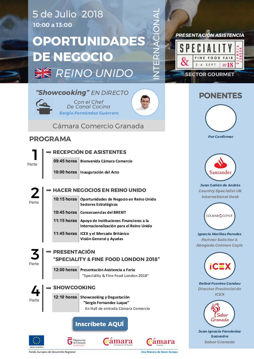 La Cámara de Comercio de Granada convoca una jornada de trabajo bajo el título “Oportunidades de Negocio en Reino Unido” en la que además se va a presentar la Feria “Speciality & Fine Food London 2018”.