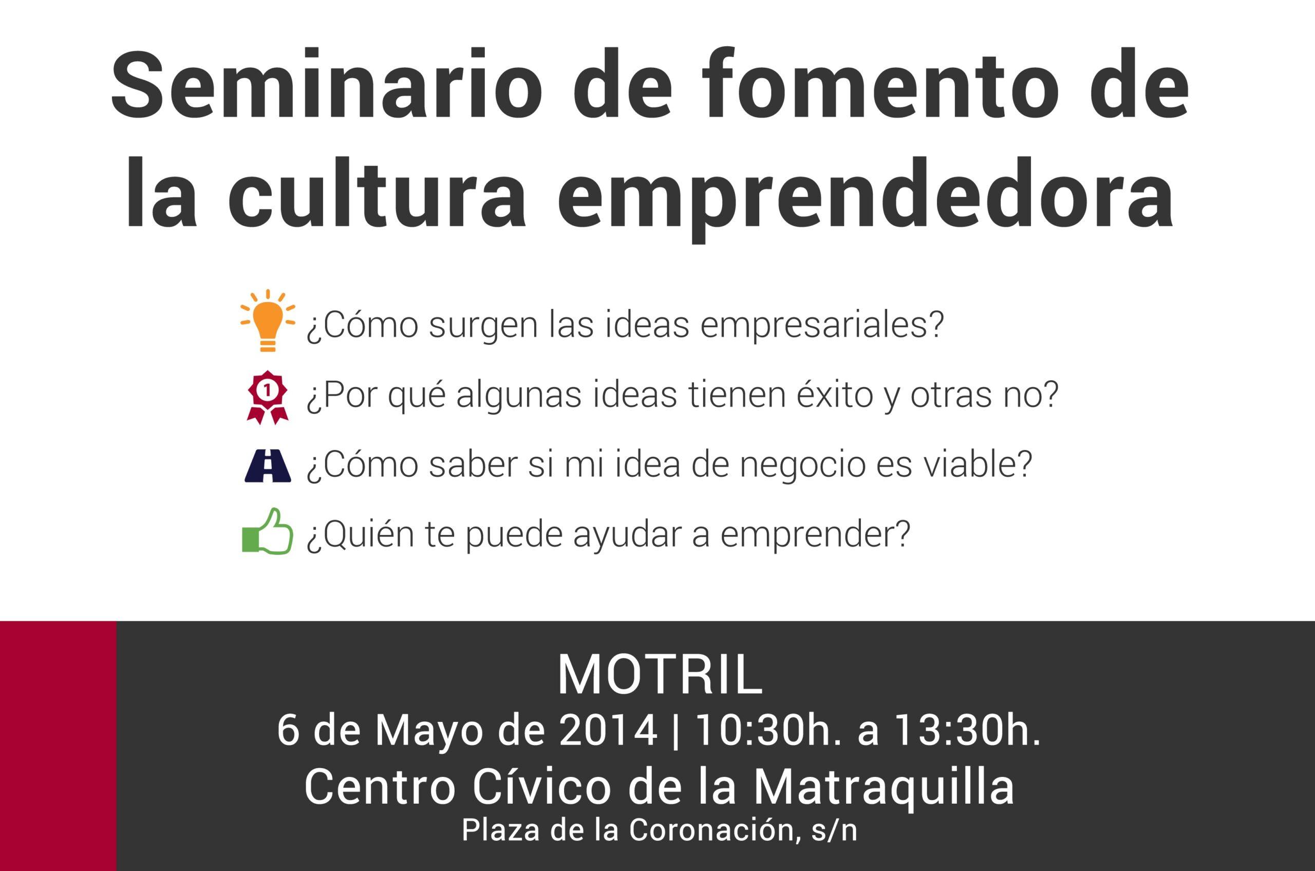 Un total de 7 Seminarios para el Fomento de la Cultura Emprendedora se van a realizar a lo largo de los meses de mayo y junio en otras tantas localidades de la provincia de Granada. El primero se realizará en Motril el 6 de mayo a las 10,30 horas de la mañana en el Centro Cívico de la Matraquilla de la capital costera.