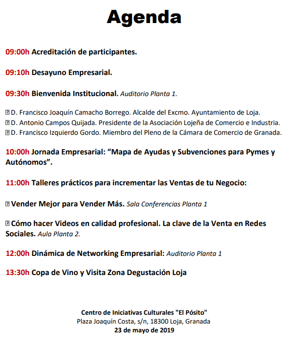 El 23 de mayo se celebrará una Jornada empresarial en el Centro de Iniciativas Culturales “El Pósito”, en Loja, en la que se informará de las principales ayudas y subvenciones para la ejecución de proyectos dirigidas a pymes.