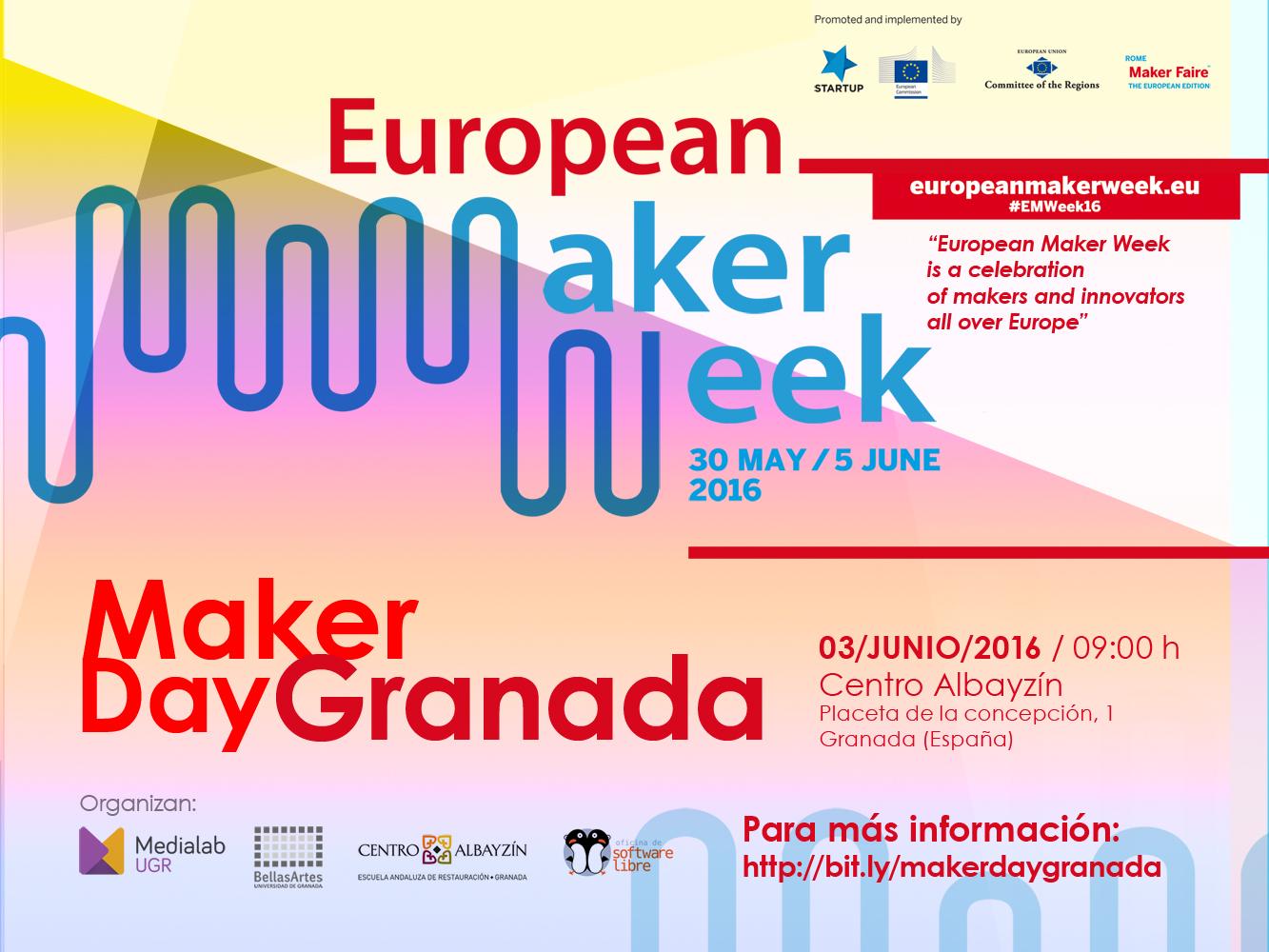 El próximo 3 de junio, dentro de la European Maker Week, MediaLab UGR, la Facultad de Bellas Artes, OSL-UGR y el Centro Albayzín organizan el Maker Day Granada en el Centro Albayzín (Placeta de la Concepción) en horario de 9 a 14 horas. El objetivo de la jornada es dar visibilidad a este movimiento en nuestra ciudad presentando ideas y proyectos así como reflexionando sobre su alcance e impacto.
