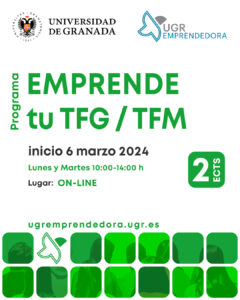 “Emprende tu TFG/TFM” es un programa que forma parte de las actuaciones desarrolladas por la Dirección de Emprendimiento para fomentar el emprendimiento entre los universitarios de la UGR.