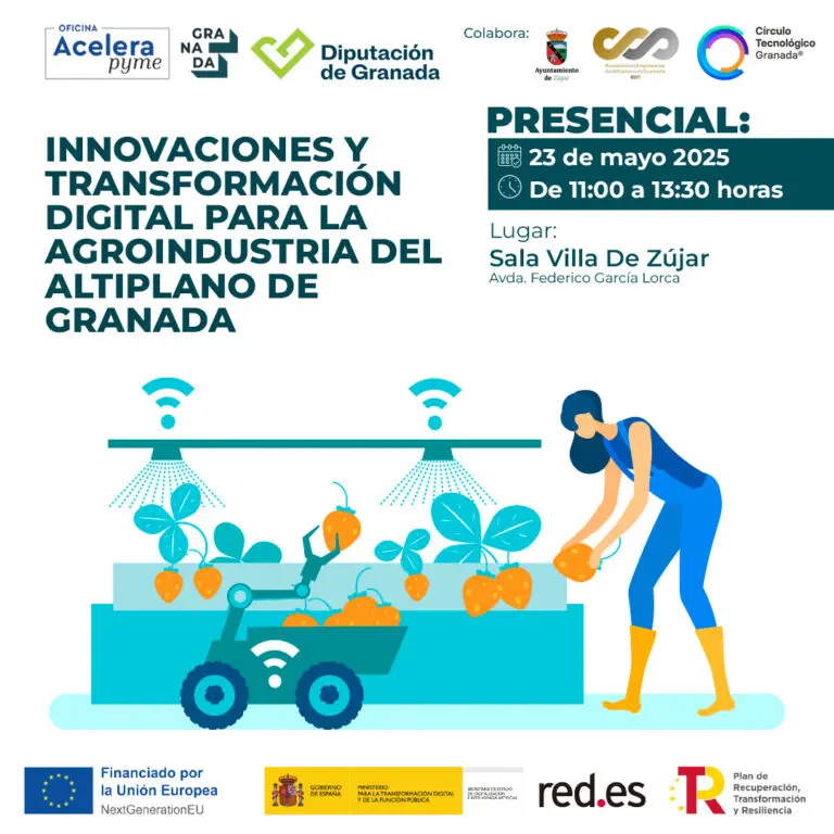 La Oficina Acelera Pyme Granada celebrará el próximo 23 de mayo a las 11:00 horas en Zújar una jornada dedicada a impulsar la transformación digital en el sector agroalimentario. Bajo el título “Innovaciones y Transformación Digital para la Agroindustria del Altiplano de Granada”, el evento ofrecerá a las empresas locales una mañana repleta de conocimientos, experiencias y oportunidades.